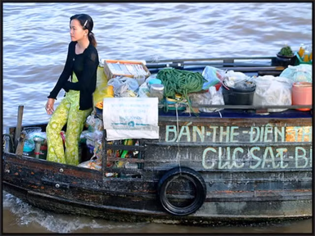 | Cũng giống như trên bờ, ở chợ nổi không chỉ có hàng trái cây mà còn có cả những chiếc thuyền, ghe chở hủ tiếu, cà phê, thuốc lá, bia, tạp phẩm... phục vụ cho những tiểu thương trên sông. Những "tài xế" này điêu luyện tới mức có thể dùng chân điều khiển ghe len lỏi khắp nơi phục vụ khách có nhu cầu |