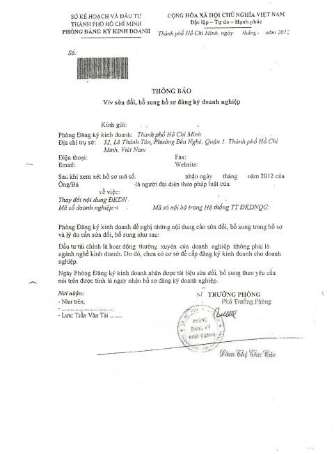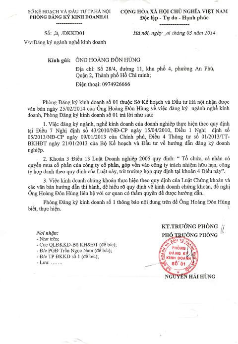 Cũng với ngành nghề kinh doanh “đầu tư góp vốn, đầu tư tài chính: góp vốn, mua cổ phần”, khi nộp hồ sơ tại Hà Nội, người viết bài này cũng được Phòng đăng ký kinh doanh trả lời bằng công văn số 24/ĐKKD01 ngày 18/3/2014 với nội dung: Luật doanh nghiệp quy định tổ chức, cá nhân có quyền mua cổ phần của Công ty cổ phần, góp vốn vào Công ty TNHH, công ty hợp danh theo quy định của luật này.