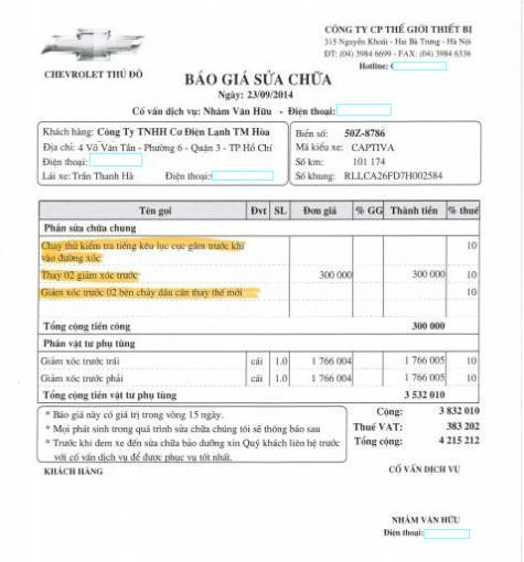 Câu chuyện của anh Vương Quốc Lộc (trú tại 306/34 Nguyễn Thị Minh Khai, phường 5, Quận 3, TP.HCM) dưới đây là một ví dụ. Phản ánh đến Báo Điện tử Giáo dục Việt Nam, anh Vương Quốc Lộc cho biết ngày 24/2/2014 anh đưa chiếc xe GM Chevrelet Captiva LTZ (xe 7 chỗ) đến Công ty Cổ phần ô tô Cường Thanh (161F Dạ Nam, Phường 3, Quận 8, TP.HCM) để kiểm tra và thay mới giảm xóc trước trái và phải.
