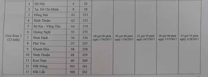 Giai đoạn 3 từ 17/6 áp dụng cho 23 tỉnh thành tỉnh, thành phố còn lại: Thủ đô Hà Nội, TP.Hồ Chí Minh, Đồng Nai, Bình Thuận, Bà Rịa-Vũng Tàu, Quảng Ngãi, Bình Định, Phú Yên, Khánh Hòa, Ninh Thuận, Kon Tum, Đắk Nông, Đắk Lắk, Lâm Đồng, Gia Lai, Vĩnh Long, Bình Phước, Long An, Tiền Giang, Bình Dương, Bến Tre, Tây Ninh, Đồng Tháp.