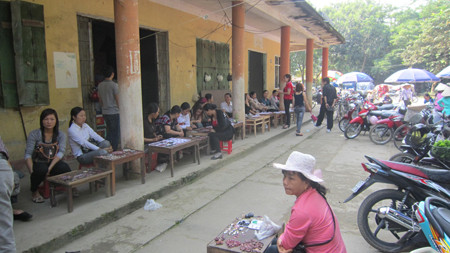 | Mỗi gian hàng đơn giản chỉ là một chiếc mặt bàn chừng 1m2, với các loại đá được xếp loại khá ngăn nắp. |