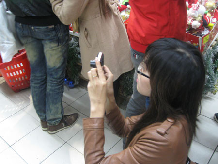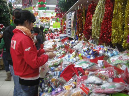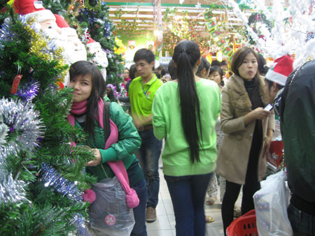 | Thay vì đi siêu thị để mua sắm, giới trẻ thích đi siêu thị để tạo dáng, chụp ảnh bên cây thông Noel đã được trang trí lộng lẫy. |