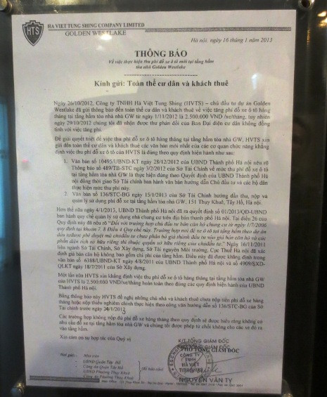 | Chủ đầu tư thông báo bắt đầu thu phí đỗ xe ngoài trời kể từ ngày 24/1. |