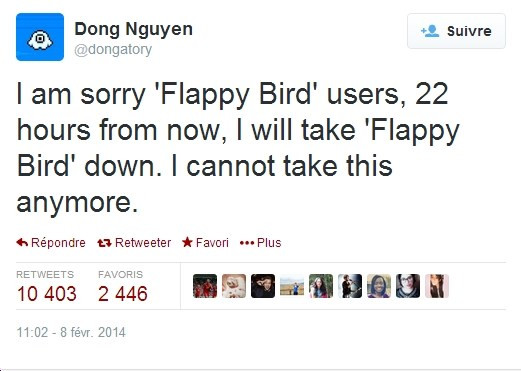 Nguyễn Hà Đông – “cha đẻ” của trò chơi Flappy Bird đang gây sốt toàn cầu tuyên bố trên tài khoản Twitter của mình rằng sẽ rút game này khỏi các kho ứng dụng trong ngày hôm nay.