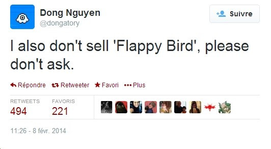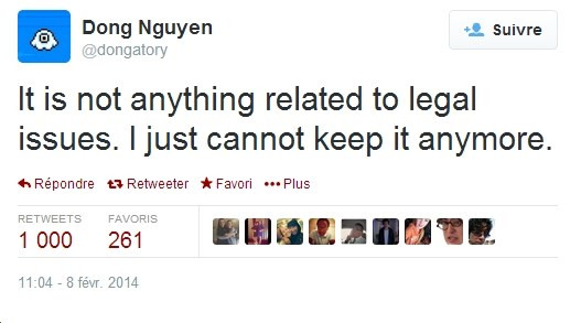 Sau đó, trong một Tweet khác, Hà Đông cho biết thêm quyết định rút Flappy Bird xuống không liên quan đến vấn đề pháp lý mà chỉ đơn thuần là anh không chịu nổi nữa.