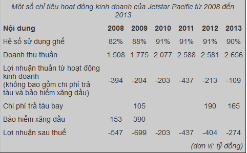 Theo báo cáo về kinh doanh 5 năm trước cổ phần hóa của Vietnam Airlines, dù lỗ kéo dài nhưng tỷ suất sinh lời trên tài sản ROA của Jetstar Pacific tăng dần từ -87% lên -67%. Lợi nhuận sau thuế năm 2013 là âm 274 tỷ đồng, so với con số 437 tỷ đồng hai năm trước đó. Trong hai năm 2012 và 2013, Jetstar tốn nhiều chi phí cho việc trả máy bay khi hãng cơ cấu lại đội tàu bay, chuyển sang dùng một loại duy nhất là A320. Sau 2013, dự kiến số lỗ nói trên sẽ còn giảm mạnh vì hãng không còn tốn chi phí cho hoạt động này.