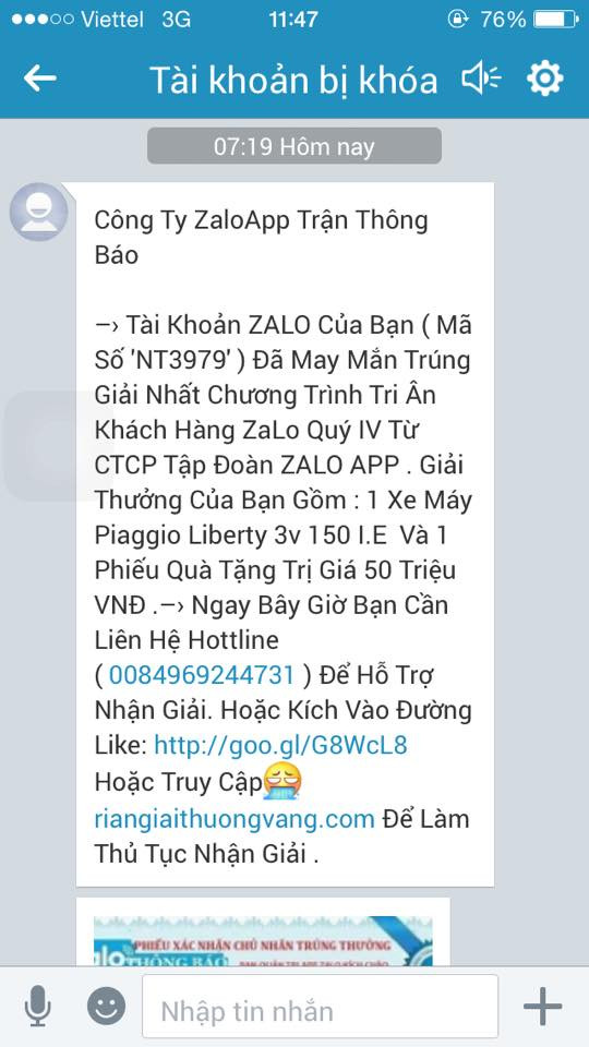 Gần đây, nhiều người sử dụng dịch vụ ứng dụng phần mềm Zalo liên tục nhận được những tin nhắn thông báo trúng thưởng khủng. Theo đó, tin nhắn thông báo trúng thưởng này còn kèm theo hình ảnh “phiếu xác nhận chủ nhân trúng thưởng” trong chương trình tuần lễ vàng “Tri ân khách hàng Zalo”.