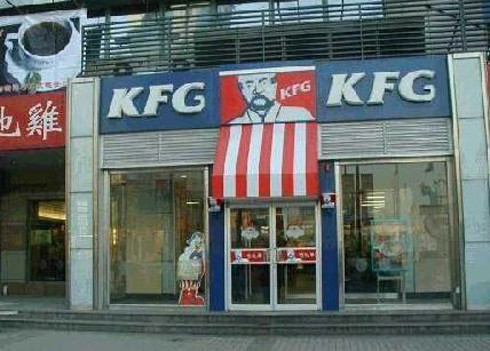 | Trong những thương hiệu bị nhái nhiều nhất phải kể đến hãng đồ ăn nhanh KFC đến từ Mỹ. Tại Trung Quốc, KFC có đủ mọi phiên bản từ KFG đến KLC. |