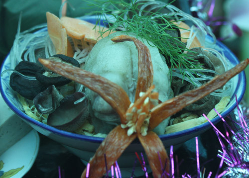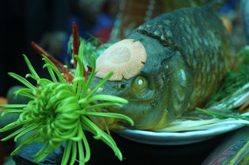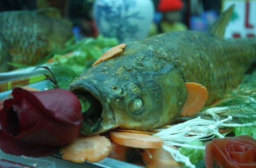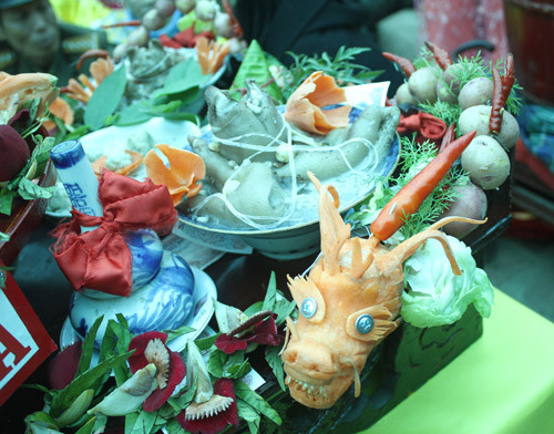 | Mâm cỗ được các làng chuẩn bị ở hội đền Trần Thái Bình năm nay được làm từ 3 loại cá: trắm, trôi và chày. Cá được làm cực kỳ ảo diệu, căng phồng đều, không xước một cái vảy. Bên cạnh đó mâm cỗ còn được trang trí thêm bằng một số món được sắp xếp đẹp mắt như giò, nem, canh … |