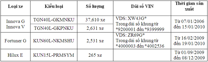 Cụ thể, theo thông tin của Tập đoàn ô tô Toyota Nhật Bản, tổng số xe bị ảnh hưởng của Chiến dịch triệu hồi này tại Việt Nam là 43.037 xe, bao gồm: 40.241 xe Innova & 2.531 xe Fortuner do TMV sản xuất và 265 xe Hilux do TMV nhập khẩu & phân phối.