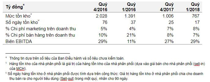 Tỉ lệ chi phí bán hàng và quản lý doanh nghiệp trên doanh thu của MCH giảm mạnh từ 39,8% trong Quý 1/2017 còn 24,5% trong Quý 1/2018.