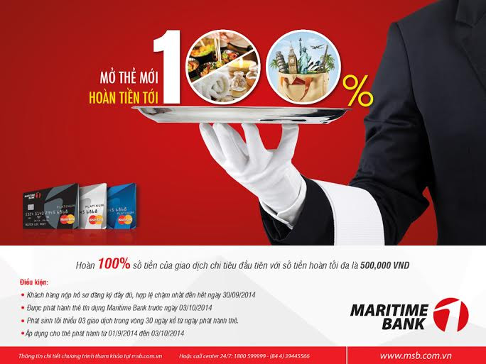 Nhằm khuyến khích khách hàng hướng tới sự tiêu dùng thông minh, quản lý chi tiêu hàng tháng một cách hiệu quả, đồng thời gia tăng lợi ích cho khách hàng, từ ngày 01 - 30/09/2014, Maritime Bank triển khai chương trình khuyến mại “Mở thẻ mới – Hoàn tiền tới 100%” dành cho các khách hàng mở mới Thẻ tín dụng Maritime Bank MasterCard.