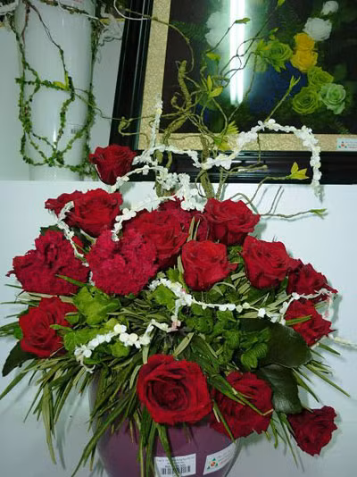 | Giỏ hoa hồng sấy khô có giá 15 triệu đồng đang được nhân viên trang trí làm đẹp. Đây là loại hoa tươi Đà Lạt sau khi thu hoạch được công ty này sấy khô bằng công nghệ sinh học Nhật Bản. Trong điều kiện bình thường, hoa tươi sấy khô có tuổi thọ kéo dài từ 3 -5 năm |