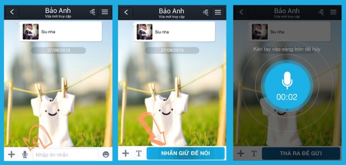 Với các ứng dụng nhắn tin thoại phổ biến hiện nay như Zalo, thao tác nhắn gửi tin nhắn còn trở nên đơn giản hơn bao giờ hết. Chỉ cần bấm vào biểu tượng micro để ghi âm lời thoại và thả tay ra, vậy là tin nhắn đã được gửi đi. Trong phiên bản mới gần đây, Zalo sử dụng cơ chế gửi tức thời nên tốc độ đã tăng lên đáng kể.
