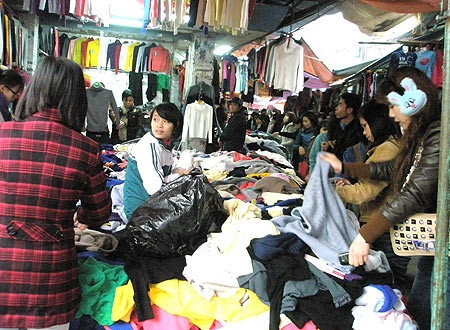 | Quần áo của chợ Ngã Tư Sở chủ yếu là hàng Trung Quốc, giá rẻ nhưng luôn được người bán hàng hét giá cao gấp 4 - 5 lần giá thị trường. |