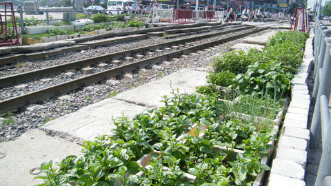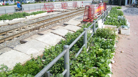 Nằm sát đường sắt, cách đường ray xe lửa chỉ chừng 1m, nhưng lại ngay một trong những ngã tư đông đúc nhất Thủ đô là ngã tư Đại Cồ Việt - Kim Liên, vườn rau của nhiều hộ gia đình quanh khu vực này lên xanh tốtDọc hai bên đường sắt có khoảng hơn 50 hộp xốp được xếp dọc 2 bên. Đủ các loại rau mùng tơi, rau đay, muống... xanh mượt tràn trề sức sống, khắc hẳn với bốn bên đường sắt, đường bê tông khô cằn.