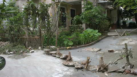Vườn rau chỉ chừng 1m2, án ngữ trước cửa ngôi nhà. Nó không chỉ có các loại rau dễ sống như khoai lang, vườn rau được dựng lên từ hộp xốp và gạch còn có 3, 4 cây cà chua đã cao chừng 20cm được chống bằng những thanh gỗ nhỏ và một cây chanh xanh um lá bánh tẻ. Đây không phải là trường hợp duy nhất trên con đường này, đến số 162A ngay bên đường lại tiếp tục có một vườn rau trồng muống hạt, khoai lang.