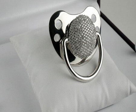 Một bản sao của núm vú silicone chính hãng, núm vú lấp lánh kim cương là một món quà hoàn hảo cho một "em bé triệu đô". Với 278 viên kim cương vàng trắng của châu Âu, núm vú có thể được tùy chỉnh khắc ngày sinh hoặc tên của em bé.