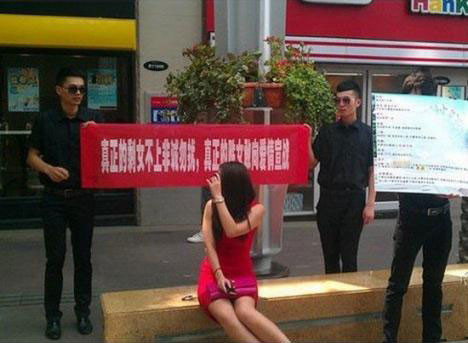 | 10h sáng 19/8 vừa qua, một cô gái với váy đỏ duyên dáng cùng các vệ sĩ cầm băng rôn và một tấm bảng đã đứng tại quảng trường Trung tâm Thương mại Vũ Hán (Trung Quốc) để tìm một người chồng phù hợp. |