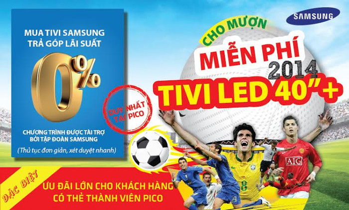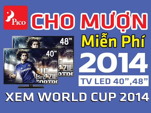 Theo đó, từ 23/5 - 15/7/2014, siêu thị Điện máy PICO sẽ cho mượn 2014 Tivi LED với 2 kích cỡ 40” & 48”miễn phí để xem bóng đá. Trong bối cảnh nền kinh tế còn gặp nhiều khó khăn thì đây là một chương trình có ý nghĩa và thiết thực cho người tiêu dùng trong dịp World Cup 2014 này.