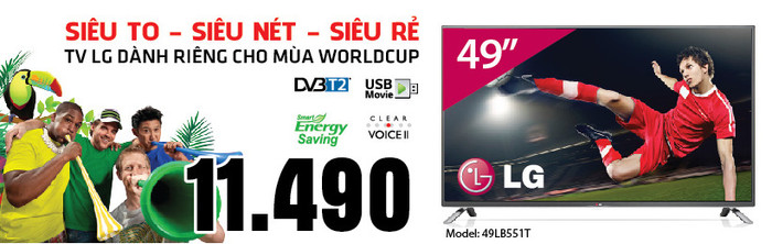 Bên cạnh đó, tùy vào từng thương hiệu TV, khách hàng lại có thêm quà tặng riêng đi kèm. Như nhãn hàng LG có chương trình Mua TV tặng Smart TV và đặc biệt hãng điện tử này cũng đã tung ra thị trường một model tivi LED có kích thước “khủng” với giá siêu rẻ chỉ 11.490.000đ để phục vụ riêng cho mùa World Cup 2014, đó chính là model 49LB551T với kích thước màn hình 49”, sử dụng tấm nền màn hình IPS cho phép hiển thị hình ảnh ở độ sáng tối ưu và lượng điện năng tiêu thụ thấp nhất, sản phẩm đượ tích hợp sẵn đầu thu KTS theo chuẩn DVB-T2.