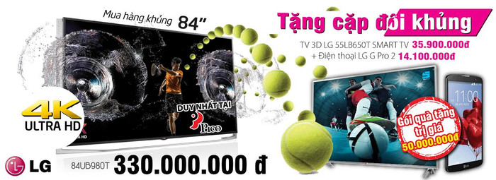 Theo đó khi mua TV với mức giá 330 triệu đồng khách hàng sẽ được tặng cặp đôi quà tặng “khủng” trị giá 50.000.000 đồng bao gồm 01 TV LG 3D SmartTV 55” (55LB650T) + 01 Smart phone LG G Pro2.