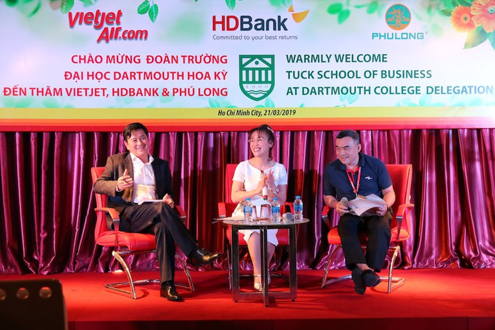 Phó Tổng giám đốc Trần Hoài Nam đã thay mặt cho ban lãnh đạo Vietjet, HDBank giới thiệu với hai giáo sư Edward Miller và Emily Blanchard cùng 24 nghiên cứu sinh MBA của trường Dartmouth về Vietjet, HDBank – các doanh nghiệp tư nhân thành công, tiêu biểu trong các ngành kinh tế năng động và phát triển hàng đầu Việt Nam là hàng không, tài chính-ngân hàng…