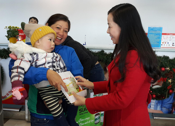 | Phó Tổng Giám đốc Vietjet Nguyễn Thị Thúy Bình tặng quà và gửi lời chúc an lành đến hành khách trong ngày đầu năm mới. |