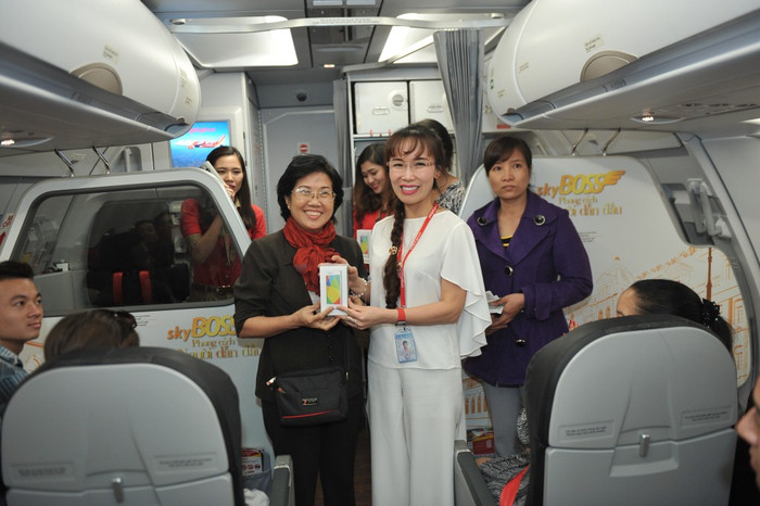 | Tổng giám đốc Vietjet Nguyễn Thị Phương Thảo tặng quà chụp ảnh lưu niệm cùng hành khách |