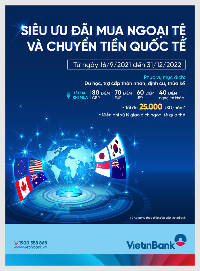 Từ ngày 16/9/2021 đến ngày 31/12/2022, VietinBank triển khai 4 chương trình ưu đãi tới Quý khách hàng có nhu cầu chuyển tiền quốc tế với các mục đích: Du học, định cư, trợ cấp thân nhân, thừa kế tại 8 thị trường: Mỹ, Canada, Châu Âu, Úc, New Zealand, Nhật Bản, Hàn Quốc, Singapore.