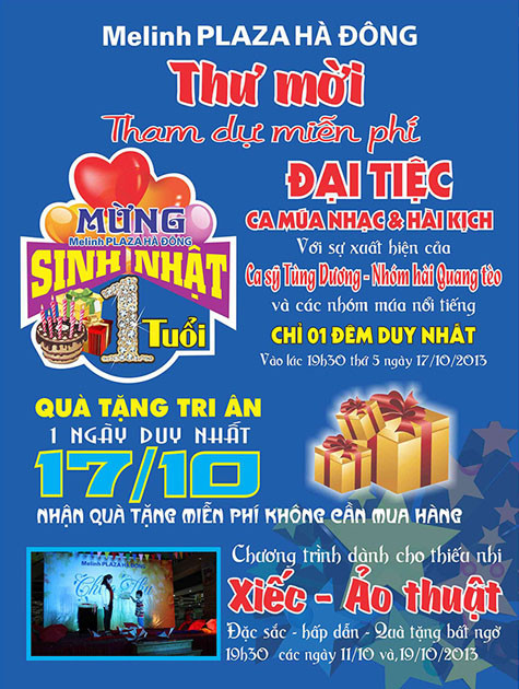Không chỉ tặng quà trong ngày 17/10, Melinh PLAZA Hà Đông còn triển khai hàng loạt các hoạt động khuyến mãi lớn trong khoảng thời gian từ 01/10 đến hết ngày 30/11/2013, nhằm mang đến những cơ hội mua sắm tốt nhất cho người tiêu dùng.