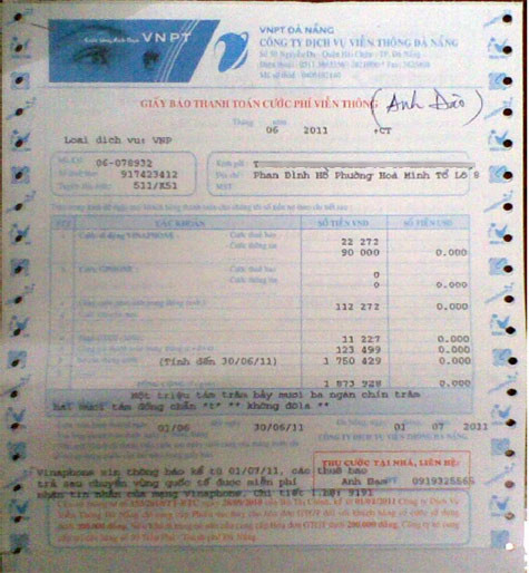 Phản hồi đến báo điện tử Giáo Dục Việt Nam, anh Nguyễn Thượng Tặng (Phạm Đình Hổ - Đà Nẵng) cho biết: Tháng 6/2011, anh đăng ký dịch vụ trả sau của VinaPhone, đầu số 0917.xxx.412. Tuy nhiên, đến ngày thanh toán cước, anh Tặng không khỏi tá hỏa vì tiền cước sử dụng trong tháng cao gấp 4 lần so với trước đây, khi anh vẫn còn đang sử dụng dịch vụ trả trước.