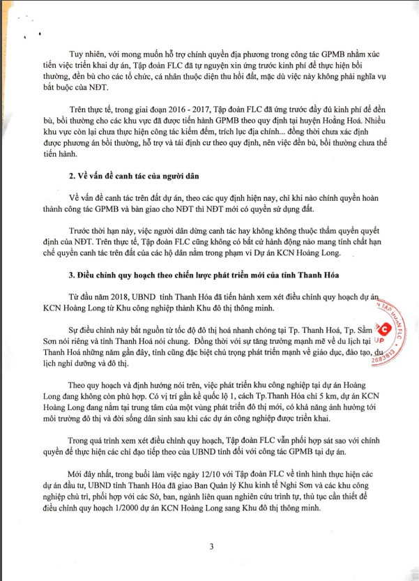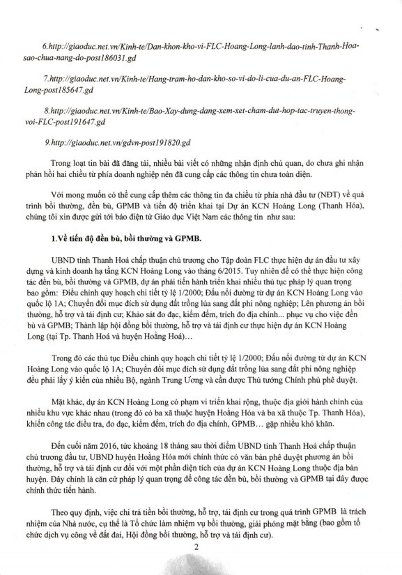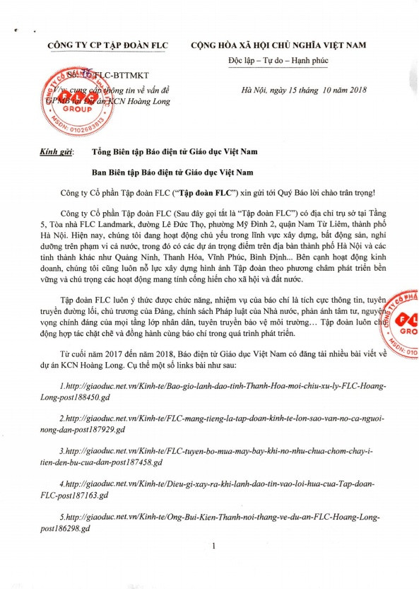Ngày 15/10/2018, Công ty Cổ phần Tập đoàn FLC (Tập đoàn FLC) đã gửi đến Báo Điện tử Giáo dục Việt Nam văn bản Số: 735/FLC-BTTMKT v/v: cung cấp thông tin về vấn đề GPMB tại Dự án KCN Hoàng Long.