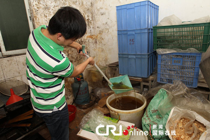 Trong không gian chật hẹp, khu vực sản xuất bẩn thỉu, luộm thuộm với vô số xô chậu, vỏ, hộp. Những thùng nhựa to được dùng được dầu trong chế biến bánh Trung thu.