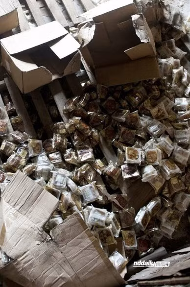 Bên trong thùng có hàng chục túi lòng đỏ trứng gà đang đợi được đưa vào sản xuất. Tất cả đều được bảo quản sơ sài, nếu không muốn nói là không có dụng cụ đảm bảo.