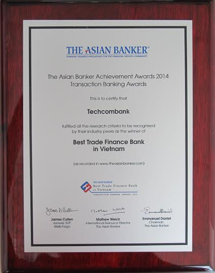Đây là năm thứ 2 liên tiếp, Techcombank được Asian Banker trao tặng giải thưởng Ngân hàng tài trợ thương mại tốt nhất Việt Nam.