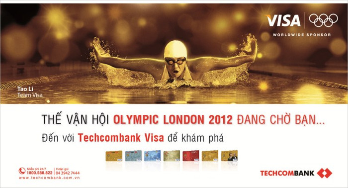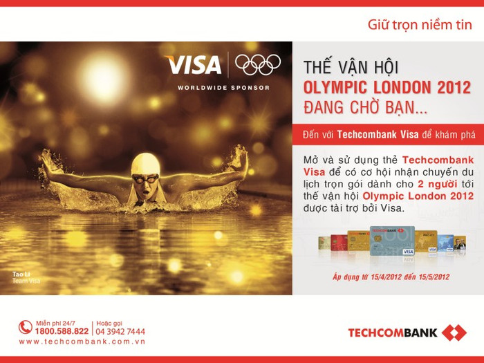 Với sự hợp tác của Tổ chức thẻ quốc tế Visa, từ ngày 15/04 đến ngày 15/05/2012, chỉ cần sở hữu và thanh toán bằng thẻ Techcombank Visa, chủ thẻ sẽ có cơ hội trúng gói giải thưởng dành cho 02 người là chuyến du lịch nước Anh cùng cơ hội tham dự các sự kiện của Thế vận hội London 2012 và nhận hàng nghìn giải thưởng có giá trị khác.