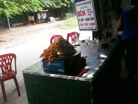 Dọc tuyến đường dẫn vào Phủ Tây Hồ ngay bên bờ hồ Tây, Hà Nội, những cửa hàng bánh tôm mọc lên san sát, cửa hàng nào cũng có những dòng giới thiệu lớn: “Đặc sản bánh tôm Hồ Tây”. Trong vai một thực khách muốn thưởng thức món bánh đặc sản Hà Thành, tôi tạt vào một quán ăn chỉ cách phủ Tây Hồ vài bước chân.