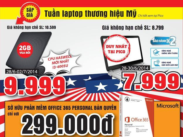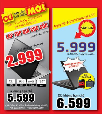 - Đổi máy tính cũ lấy laptop mới với giá không tưởng: Khi mang 01 desktop cũ bất kỳ vẫn còn còn hoạt động thì bạn có thể đổi lấy ngay 01 laptop Asus (model X451CAVX026D) mới 100% và các thêm 2.999.000đ ( Hình thức: Bốc thăm | Áp dụng 148GV: 05 bộ | Thời gian: 10:00 am - 11:00 am (29/6/2014), với model này nếu bạn muốn mua ngay thì PICO cũng sẽ mang đến cho bạn mức giá ưu đãi chỉ 5.599.000đ và được tặng thêm quà khuyến mại.