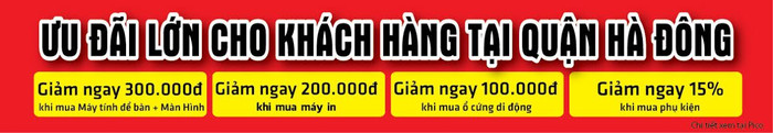 - Chương trình Ưu đãi cho các khách hàng thuộc địa bàn quận Hà Đông: Giảm ngay 300.000 đồng khi mua Máy tính để bàn + Màn Hình, giảm 200.000 đồng khi mua Máy in, giảm 100.000đ cho khách hàng mua ổ cứng và giảm 15% khi mua các phụ kiện IT.