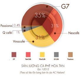 Cũng trong thông cáo, Trung Nguyên trích số liệu của Nielsen để khẳng định thị phần G7 tiếp tục tăng lên trên thị trường cafe hòa tan. Theo đó, trong quý I năm 2012, G7 dẫn đầu về thị phần (40%) và sản lượng (35%) của ngành cafe hòa tan.