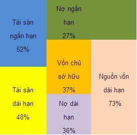 • Nguồn vốn dài hạn chiếm đến 73% (các tỷ lệ được tính trên tổng tài sản), trong khi đó tài sản dài hạn chỉ chiếm 48%. Như vậy, phần nguồn vốn dài hạn được sử dụng để tài trợ cho tài sản ngắn hạn là 25%. Đây có thể xem là một cái “đệm” an toàn về thanh khoản.