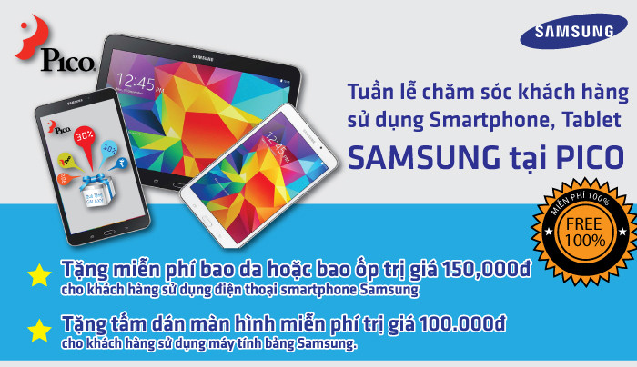 Khi đến PICO trong thời gian này khách hàng có đang sử dụng điện thoại thông minh, máy tính bảng Samsung sẽ được nhận ngay những phần có có giá trị, điều đặc biệt là khách hàng không mua hàng của PICO vẫn được nhận quà tặng: