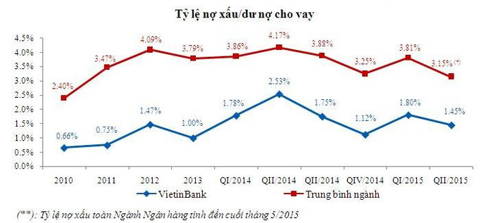 Tính đến hết quý II/2015, tỷ lệ nợ xấu của VietinBank chiếm 1,45% dư nợ cho vay khách hàng, duy trì ở mức thấp hơn nhiều so với mức trung bình Ngành.