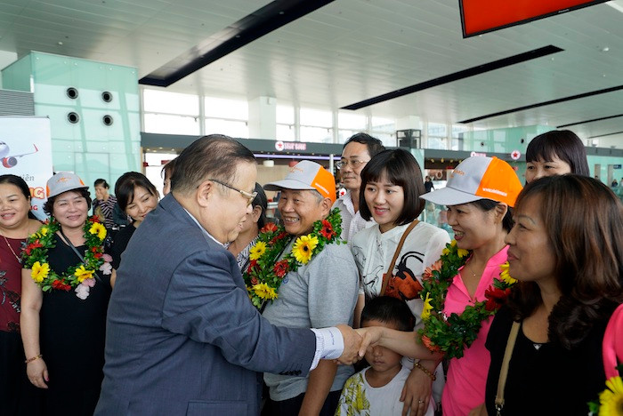 | Phó Tổng giám đốc Vietjet Nguyễn Đức Tâm tặng hoa chào đón những hành khách đầu tiên. |