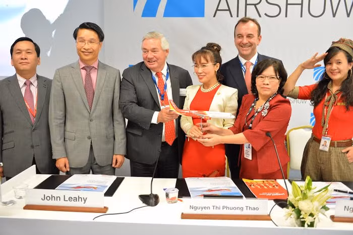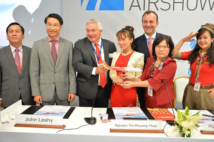 | Bà Nguyễn Thanh Hà - Chủ tịch Hội đồng Quản trị Vietjet; Bà Nguyễn Thị Phương Thảo - Tổng giám đốc Vietjet và ông John Leahy, Tổng giám đốc phát triển thương mại toàn cầu của Airbus đã ký kết hợp đồng. |