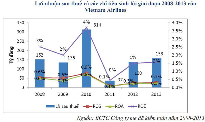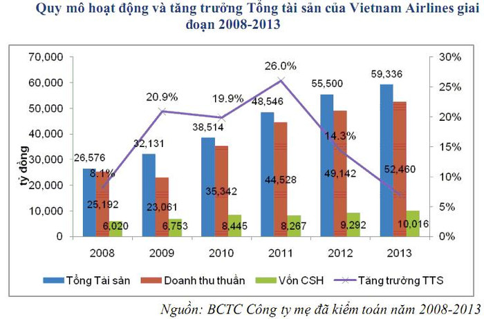 Tính theo số liệu báo cáo tài chính kiểm toán hợp nhất vào thời điểm 31/12/2013, khoảng 74% số dư vay nợ của Vietnam Airlines được Chính phủ bảo lãnh.
