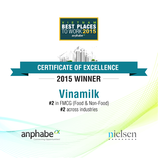Theo kết quả cuộc khảo sát thường niên chuyên nghiệp và chuyên sâu về thương hiệu nhà tuyển dụng: “Nơi làm việc tốt nhất Việt Nam 2015” vừa đượcNielson và Anphabe công bố vào tháng 3/2016, Vinamilk tiếp tục được bình chọn và giữ vị trí thứ 2 trong Top 100 công ty làm việc tốt nhất Việt Nam năm 2015, sau một đại diện nước ngoài.