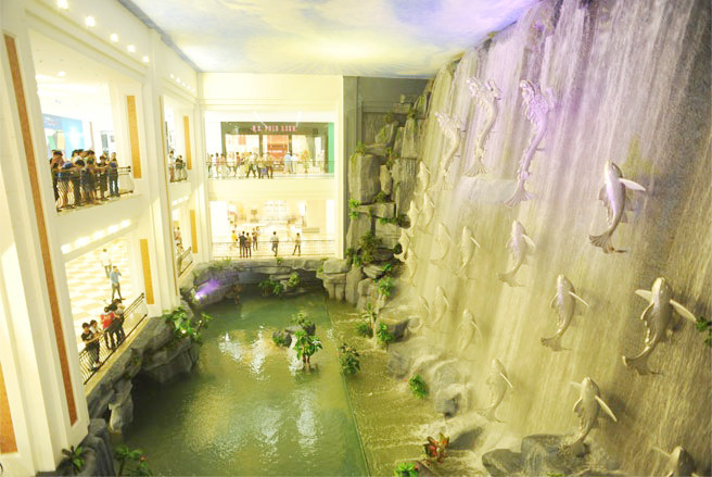 Ngay khi bước chân xuống từ cổng chính khu TTTM, du khách sẽ bắt gặp thác nước khổng lồ lấp lánh cao tới 14m, tái hiện Tích cá chép vượt vũ môn hóa rồng.