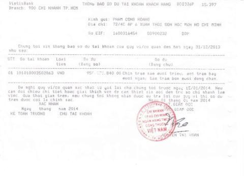 Một bằng chứng chứng minh số tiền mà 19 nhân viên ACB đem gửi đã vào tài khoản của Ngân hàng Công thương đó là bản Thông báo số dư tài khoản khách hàng do chính Ngân hàng Công thương chi nhánh TP HCM gửi khách hàng Phạm Công Hoàng (nhân viên nhận ủy thác của ACB để gửi tiền vào Ngân hàng Công thương) có nội dung: “Chúng tôi xin thông báo số dư tài khoản của quý vị đến hết ngày 31/12/2013 là 950.170.840 (Chín trăm năm mươi triệu, một trăm bảy mươi nghìn, tám trăm bốn mươi đồng chẵn”.